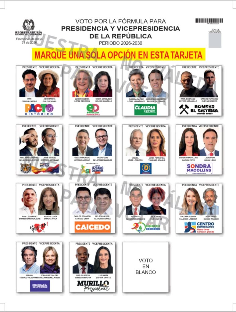 De acuerdo con el documento oficial conocido tras el sorteo , el tarjetón incluirá múltiples fórmulas presidenciales, entre ellas: