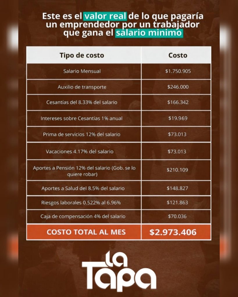 Un emprendedor colombiano que decida contratar en 2026 a un trabajador que devengue el salario mínimo no solo deberá asumir el pago del sueldo básico, sino una serie de obligaciones legales que elevan de manera significativa el costo real de la contratación. De acuerdo con los datos consolidados en la gráfica, el gasto total mensual por cada trabajador asciende a $2.973.406, una cifra que evidencia la carga que representa el empleo formal para pequeños y medianos negocios.