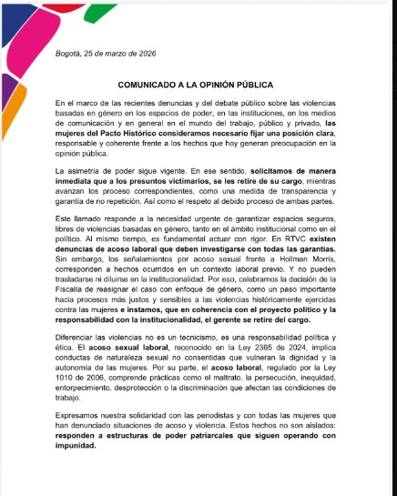 La controversia alrededor del sistema de medios públicos RTVC se intensifica. Un grupo de mujeres de la bancada del Pacto Histórico solicitó públicamente la salida de Hollman Morris, en medio de denuncias por presunto acoso sexual y laboral.