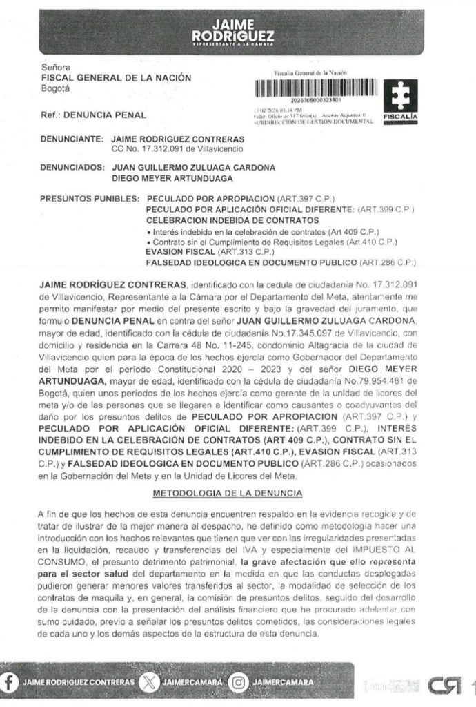 En la denuncia se solicita indagar la posible responsabilidad del exgobernador del Meta Juan Guillermo Zuluaga Cardona y de Diego Meyer Artunduaga, quien actualmente ocupa el cargo de contralor departamental y durante el periodo mencionado se desempeñaba como gerente de la Unidad de Licores del Meta. El escrito plantea que los hechos podrían configurar delitos como peculado por apropiación, evasión fiscal, falsedad ideológica en documento público, interés indebido en la celebración de contratos y celebración de contratos sin cumplimiento de requisitos legales.
