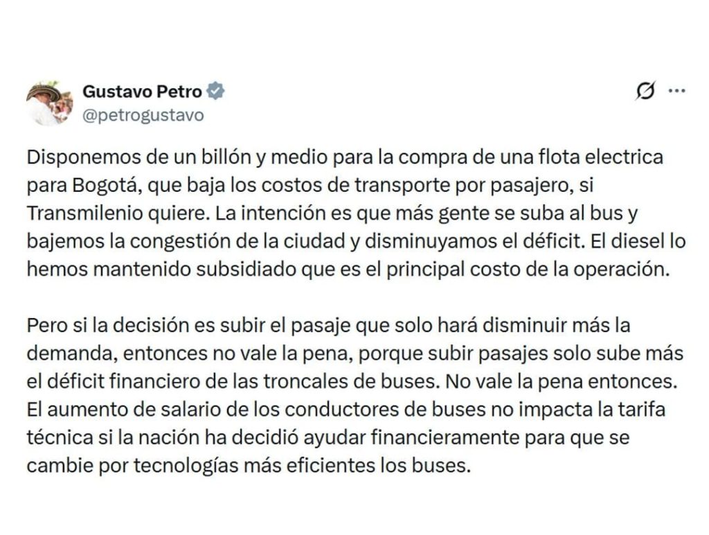 Frente al trino del presidente en el que proponía destinar 1,5 billones de pesos para la compra de una flota de buses eléctricos que ayudaría a contener posibles aumentos tarifarios, Galán aclaró que el compromiso firmado por el Gobierno Nacional con Bogotá hasta el momento es de 938 mil millones de pesos y que los recursos adicionales anunciados aún no están garantizados para este año.